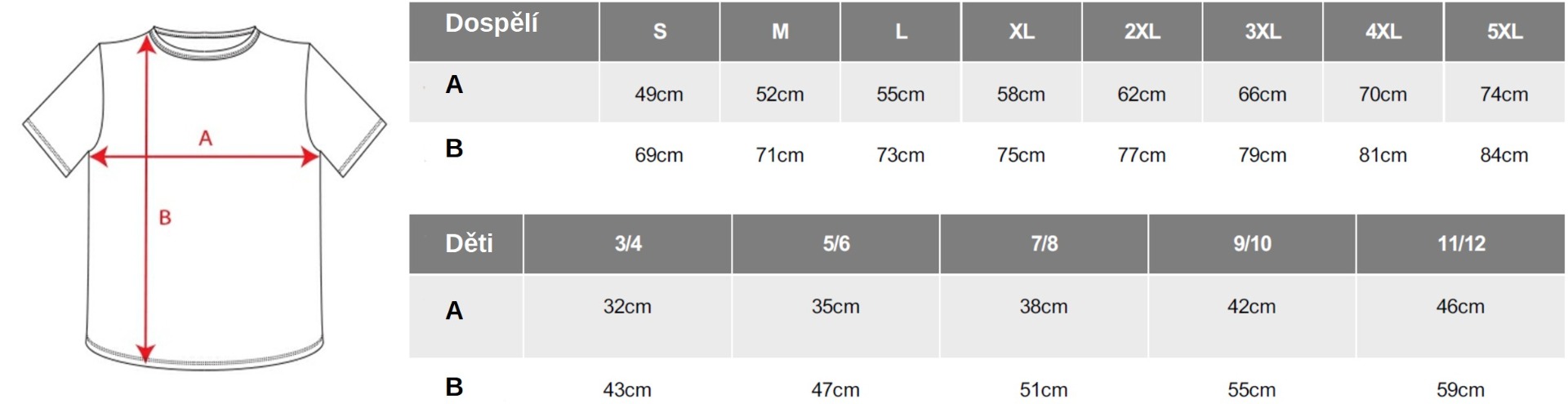 Tričko s krátkým rukávem bez bočních švů. Kulatý průkrčník s elastanem. Dětské velikosti mají boční švy.